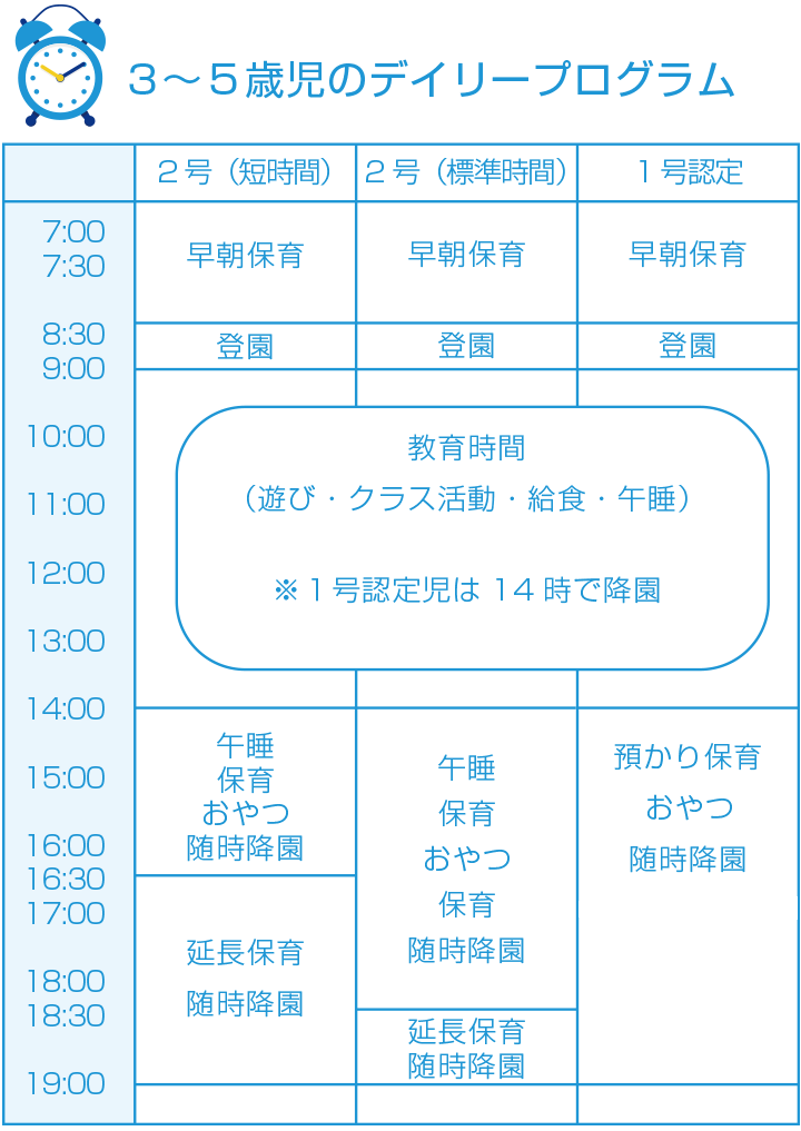 土曜日 | 保育時間 | 7:30~18:30 (2・3号認定児のみ) |